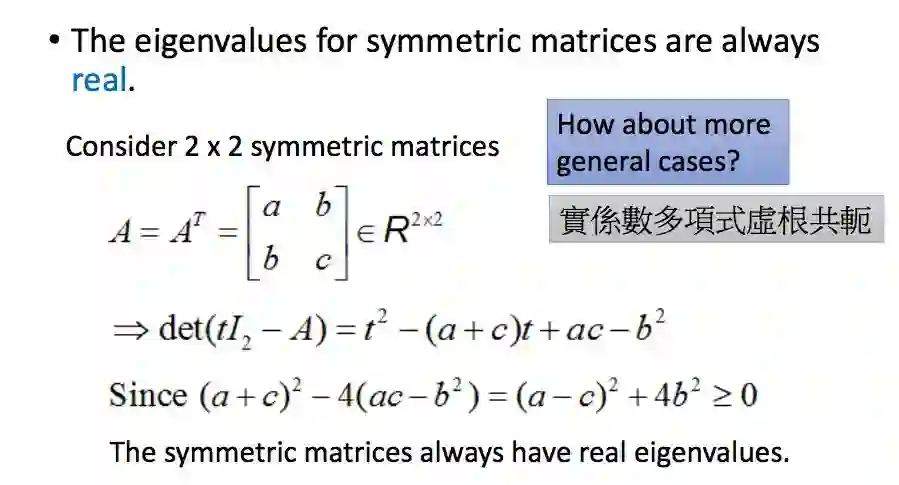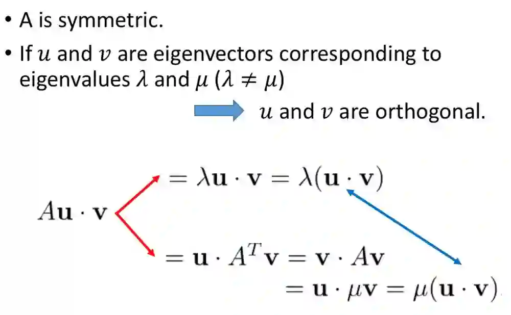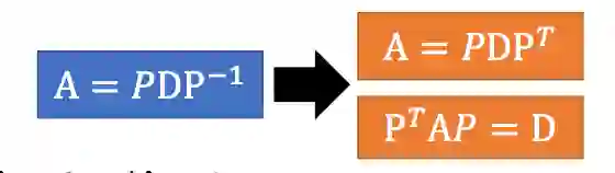 对称矩阵一定是可以对角化的(相关的证明网上可以找到,这里就不证明了),我们之前介绍过,对于一个可对角化的矩阵,它的特征向量之间都是线性无关的,根据这个性质,如果一个n阶对称阵有n个不同特征值的话,其对应的特征向量是两两正交的,那么其组成的矩阵就可以是一个正交矩阵,如果存在重根,其对应的特征向量之间不一定是正交的,但总是可以通过正交化的方式转换成正交的。因此对于对称矩阵来说,之前讲过的对角化的方式可以变为: