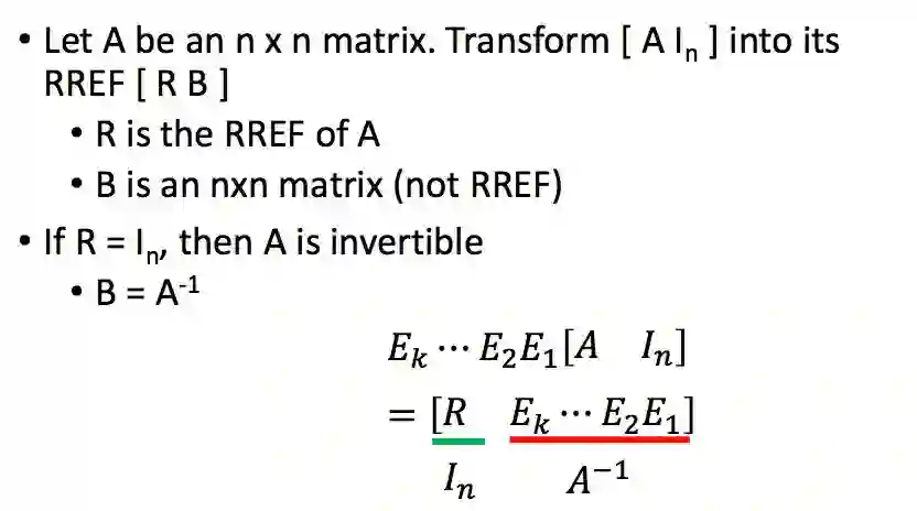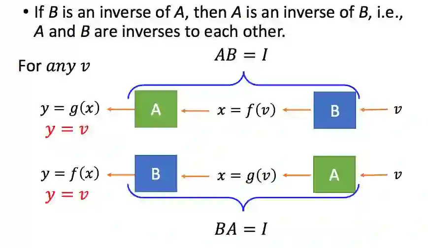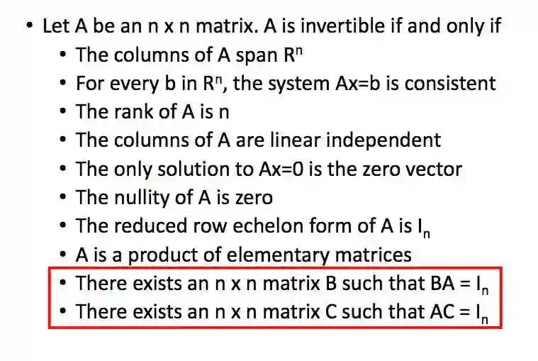 一个矩阵是可逆的(invertible)的,必须满足两个条件,首先要是方阵,其次是可以找到另一个方阵B,使得AB=I。