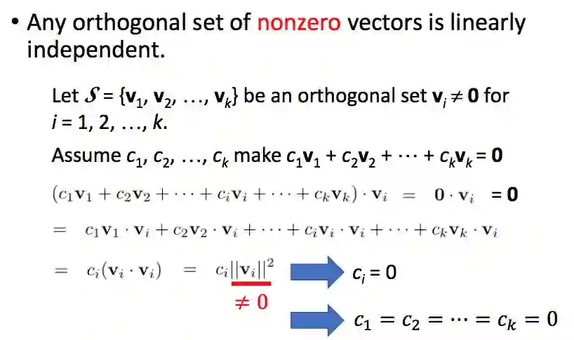 如果一组向量中任意两个向量都是正交的,那么我们可以称这组向量为正交集(Orthogonal Set)。不含零向量的正交集中的向量是线性无关的,证明如下: