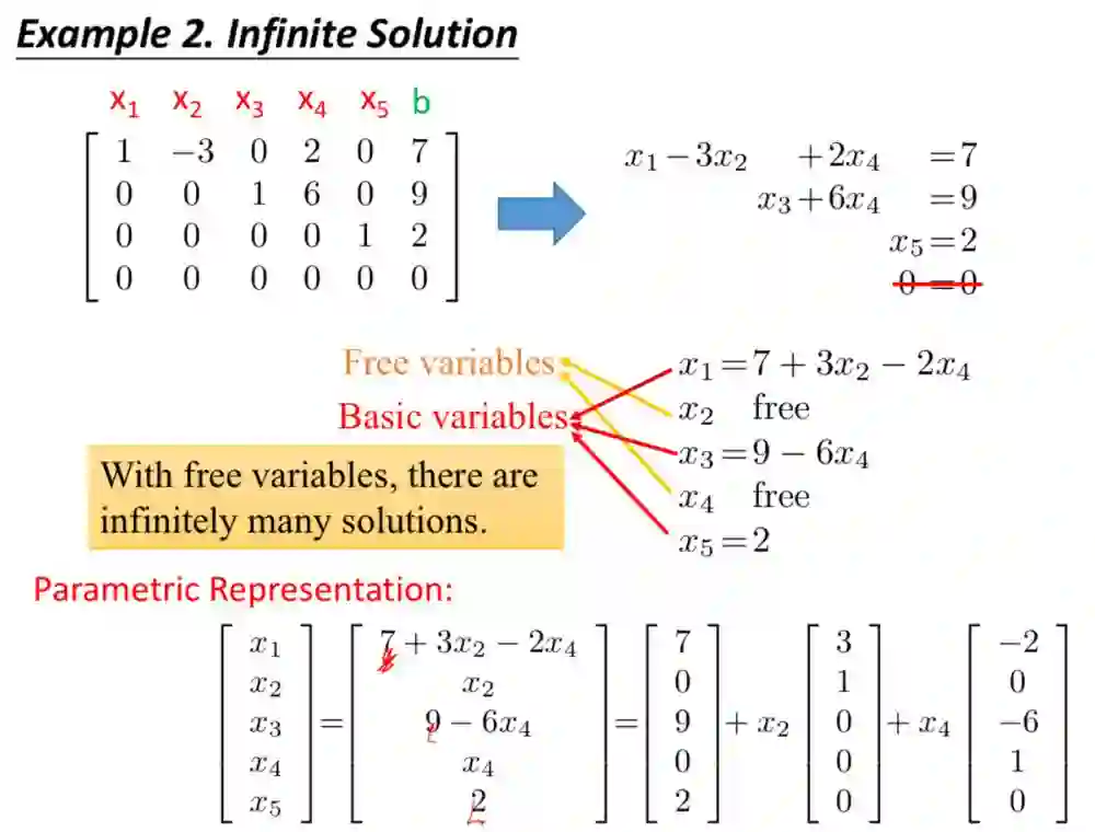 下面的例子是有无穷多个解的情况,可以看到,第1、3、5列是包含先导元素的标准向量,其对应的变量也称为基本变量,而第2、4个变量被称为自由变量: