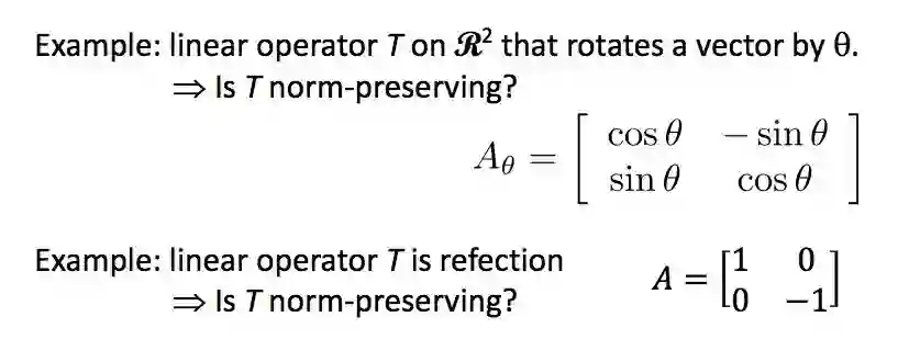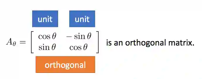 我们之前提到过,矩阵其实代表一种线性变换,如果将这种变换作用在任意的向量u上,不改变向量u的长度的话,我们就说该线性变换具有Norm-preserving(这里不清楚怎么翻译,暂且翻译为范数不变性)。注意,这样的u是任意的向量,比如旋转和对称反转操作就不会改变任何向量的范数: