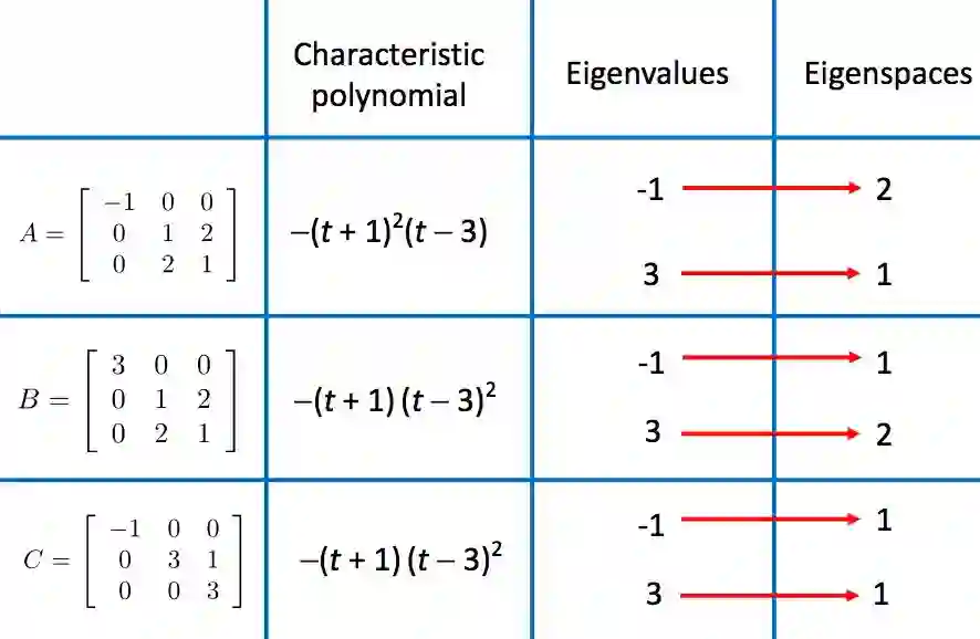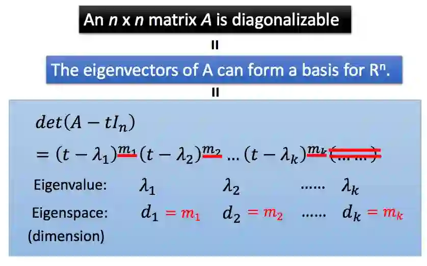 2)如果一个矩阵A可对角化,那么其特征值对应的特征空间的维度,等于该特征值重复出现的次数。