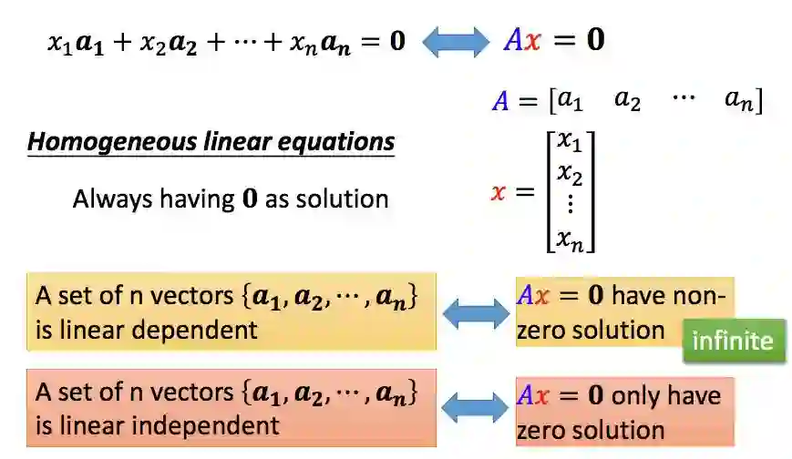 判断向量集是线性无关还是线性相关,其实就是看一个齐次方程(Homogeneous Equations)有无非零解: