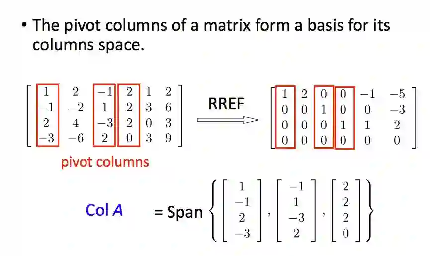 先导元素所在的列,在原矩阵中被称为主列(pivot columns),这些列是线性无关的,其他列可以有主列的线性组合得到。