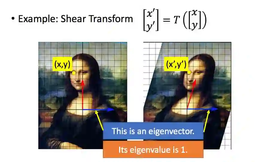 我们知道,任意非零向量都可以张成一条直线,有的向量在一个矩阵A作用后,偏离了其所张成的空间;但有的向量在矩阵A作用后,还是在原有张成的空间,矩阵A只是对该向量起到了一定的伸缩作用,那么我们就说该向量是矩阵A的特征向量(Eigenvector),而这个伸缩作用的大小我们就称为特征值(Eigenvalue)。所以我们知道,该向量所张成空间中的所有向量(零向量除外)都是该矩阵的特征向量。下面的例子中,经过变换后横轴没有发生变化,所以横轴的向量都是特征向量,特征值为1。