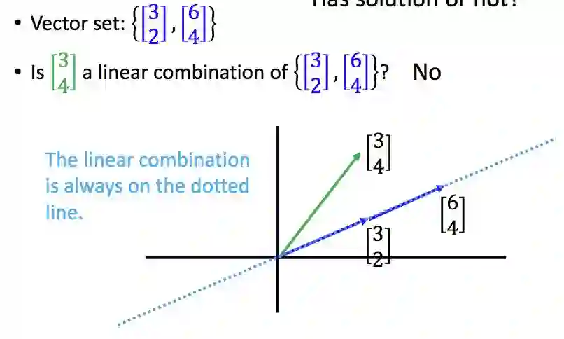 给定一个向量集,如果其中一个向量可以表示成其余向量的线性组合,那么我们就说这组向量是线性相关(Linear Dependent)的。值得注意的是,零向量是任意向量的线性组合,因此只要包含零向量的向量集,都是线性相关的。