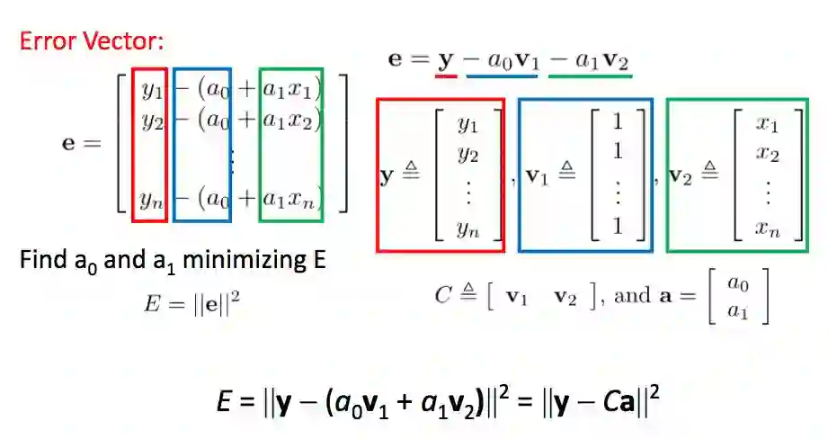这里的C是我们的训练数据,训练数据的矩阵表示相当于线性方程组的A,要找的参数a相当于线性方程组的x,实际值y相当于线性方程组的b。根据我们上一节求解正交投影的方式,Ca的值应该等于y在C张成空间中的正交投影,因此,我们可以直接计算得到参数的值: