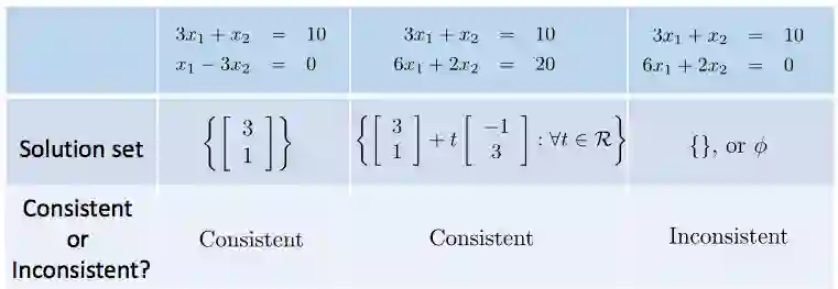 如果线性方程组有解,我们就称其为相容的(consistent),若无解,则称为不相容的(inconsistent)。