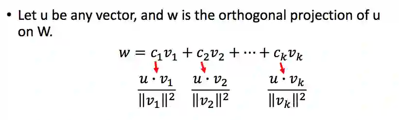 如果u是任意向量,那么u在子空间中的正交投影也很容易计算得出: