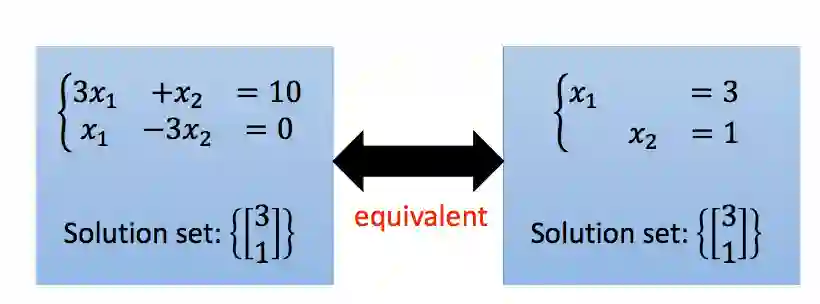 如果两个线性方程组的解集是相同的,我们就称它们是等价的(equivalent)。