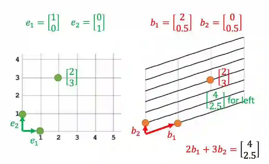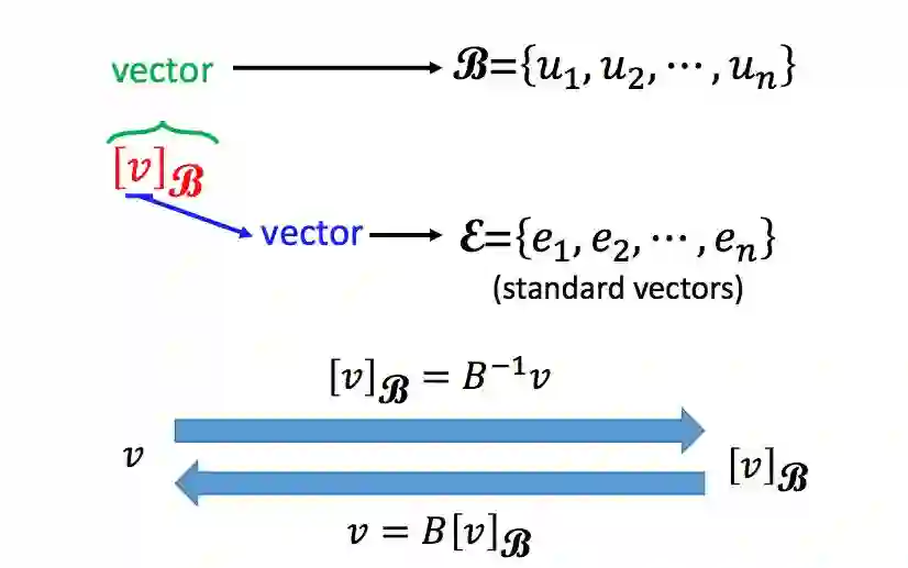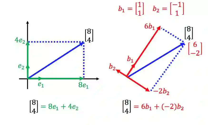 那么根据任意坐标系以及某一向量在该坐标系下的坐标,如何得到该向量呢?很简单,该向量可以表示成基的线性组合,系数即为其坐标:
