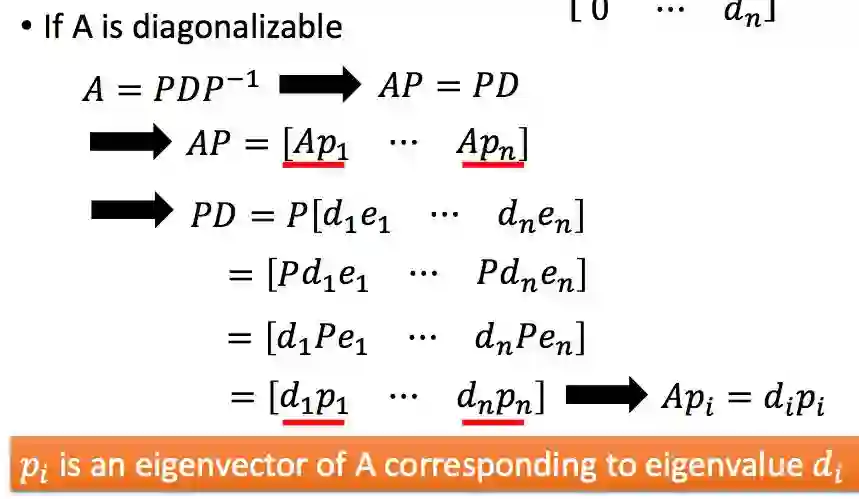 如果A是可对角化的,那么P中的列向量是A的特征向量,D中对角线元素是A的特征值,证明如下: