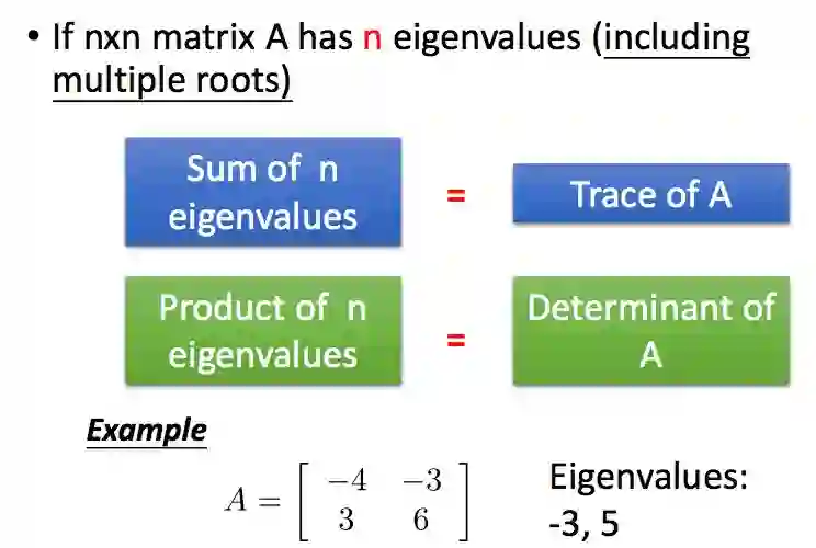 那么一个n阶方阵有多少特征值呢?最多n个。如果一个n阶方阵有n个特征值(包括重复值),那么这n个特征值的的和等于矩阵的迹(trace,即矩阵主对角线的元素之和),同时,这n个特征值的乘积等于矩阵的行列式。