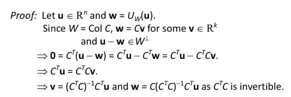 证明如下,证明中的第一步是因为u-w是垂直于子空间W中所有向量的,因此自然垂直于C中所有的列向量,因此CT(u-w)=0: