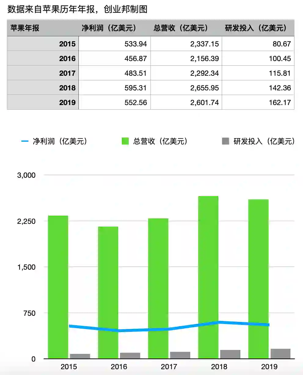 苹果去年的年报显示,2019年总营收为2601.74亿美元,净利润552.56亿美元。这些数字接近该公司2015年的表现,增长乏力。(下图)