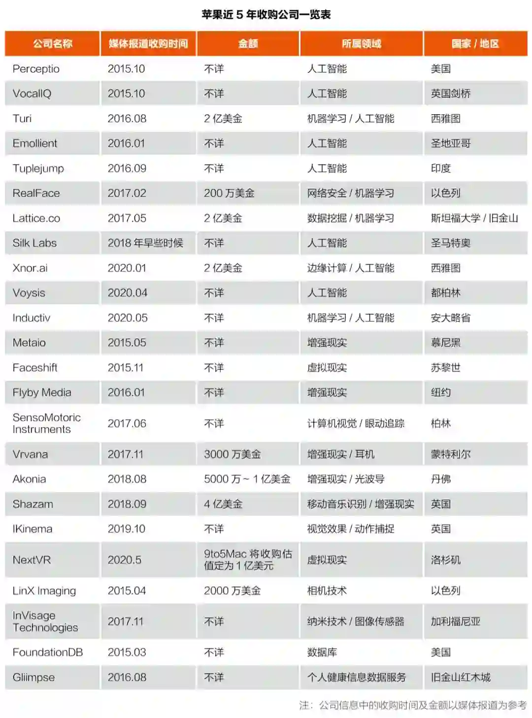 根据公开资料,创业邦将苹果近五年进行的收购动作进行了如下整理。