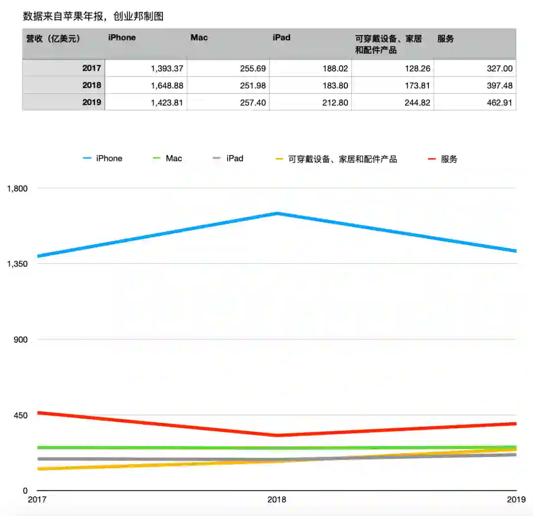 其中一个有意思的变化是,苹果在去年的年报中,开始更加强调可穿戴设备。此前财年年报中的“Other Products”变成了“Wearables, Home and Accessories”(可穿戴设备、家居和配件产品),这一类别表现抢眼,营收244.82亿美元。同比2018年增长41%。具体数据如下图: