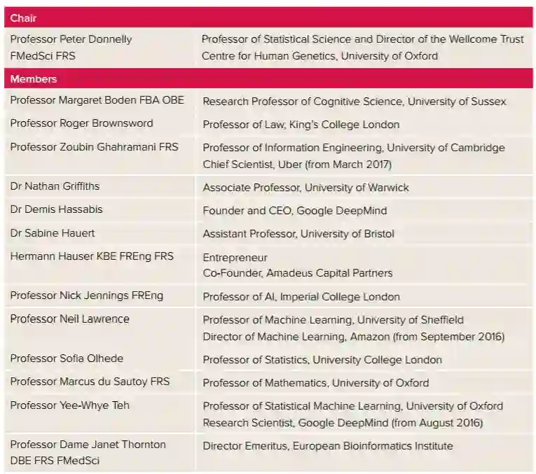 题为《机器学习:计算机的力量与希望》的报告是皇家学会机器学习工作组的工作,其 15 名成员包括目前正在大规模部署机器学习的三家公司的员工: Google DeepMind 的创始人兼首席执行官 Demis Hassabis,DeepMind 的研究科学家 Yee Whye Teh; 亚马逊机器学习总监 Neil Lawrence; 以及现任 Uber 首席科学家 Zoubin Ghahramani。