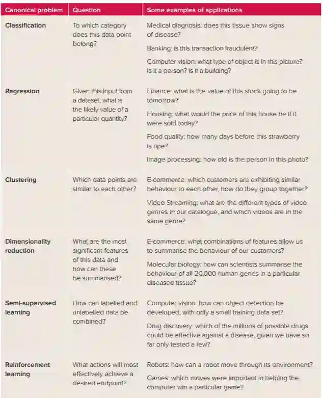 表 1:机器学习领域的典型问题,其中包括:分类、回归、聚类、降维、半监督学习、强化学习