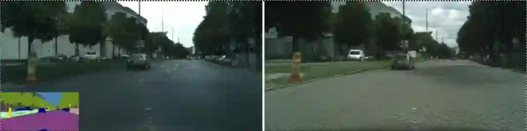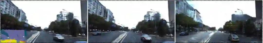 图 2:Apolloscape 的结果。左图:pix2pixHD。中间:COVST。右图:作者提出的方法。输入语义分割掩码视频在左下角展示。