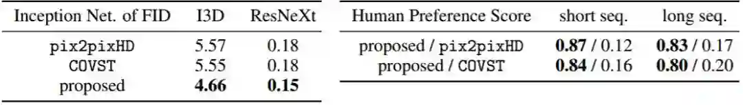 表 1:在 Cityscapes 街景数据集上视频到视频合成方法的对比结果。
