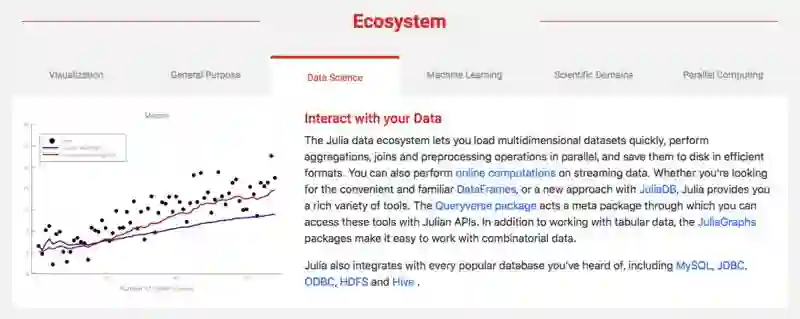 除了语言本身的优点,Julia 还拥有非常强大的生态系统,主要应用于数据可视化、通用计算、数据科学、机器学习、科学领域、并行计算六大领域。