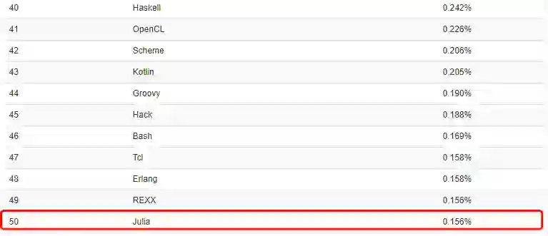 从 2012 年到现在,Julia 1.0 在编程界已经打出了自己的一片“小天地”。截至发稿前,Julia 在 Github 上已经获得了 12293 颗星星,TOIBE8 月份编程语言排行榜上已迅速攀升至第 50 名。