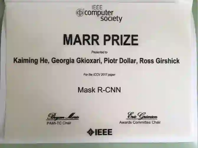 在Facebook AI实验室研究期间,何恺明仍然醉心于研究,而且颇有建树。2017年3月,何恺明和同事公布了其最新的研究Mask R-CNN,提出了一个概念上简单、灵活和通用的用于目标实例分割(object instance segmentation)框架,能够有效地检测图像中的目标,同时还能为每个实例生成一个高质量的分割掩码。同年,凭借《利用焦点损失提升物体检测效果》这篇论文,他一举夺下了另一个计算机视觉顶级会议ICCV最佳论文奖。