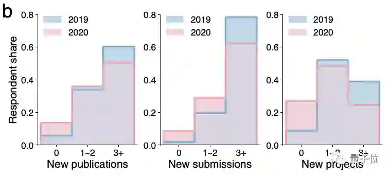 分析结果显示,在2019年时,有9%的科学家没有启动科研项目,但到了2020年,这个数字变为了27%,是2019年的三倍:
