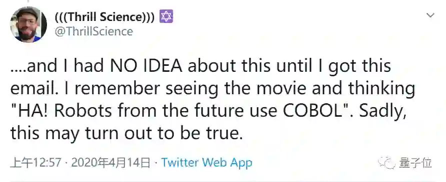 今天,Virtual Airwaves首席技术官Erlang在推特上表示,自己写的COBOL代码也出现了在《终结者》电影里。