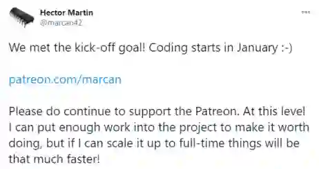 目前该项目的一阶段筹集目标已完成,Hector Martin 也在推特上表示:我们已经达到了启动目标!该项目将在一月份开始。