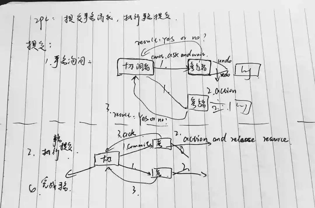 3.然后就是precommit阶段,若协调者收到了所有参与者的ACK响应,则向所有的参与者发送precommit请求。4.参与者收到后执行事务,并将操作写入本地事务日志中,成功后向协调者发送ACK响应。若协调者在第一阶段的反馈中有NO,或者协调者等待超时,则向所有的参与者发送中断请求。