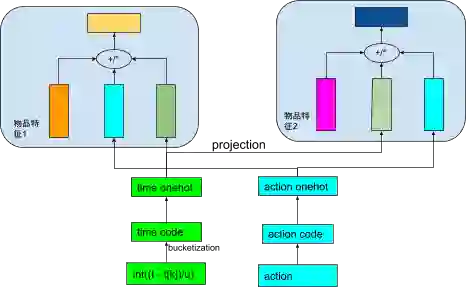 除了物品特征信息之外,我们也可以引入事件上下文信息对用户的时序行为进行建模,主要包括事件发生时间,地点以及事件行为类型。上下文信息的建模方式同离散特征建模方式类似,通常上下文信息取值范围不会太大,可以直接使用 one_hot 编码。上下文信息中事件的时间是比较重要的信息:如前提到的,序列推荐相对于自然语言中的序列模型虽然没有非常强的先后依赖关系,但是对于刻画用户的长期行为和短期行为以及用户行为随时间的变化趋势,时间上下文还是非常重要的。我们通常不直接使用时间戳的绝对值,而是对时间进行分桶,如我们可以在事件发生的时间与目标预测的时间之间取一个相对间隔:,其中 t 是当前目标预测时间戳,