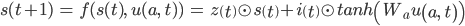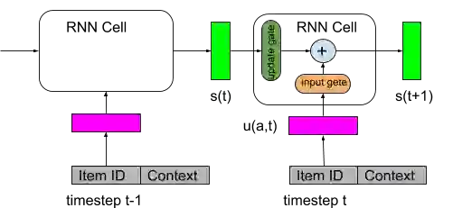 其中 s(t) 是第 t 步的输入状态,来自于第 t-1 步 RNN 单元的输出状态,同时在 t 步用户对推荐物品 a 产生行为,其中 a 对应的 embedding 是 u(a, t),包括 t 时刻物品的 embedding 和 t 时刻的上下文 embedding。将 s(t) 和 u(a, t) 输入第 t 步 RNN 单元的 update gate 和 input gate,产生输出状态 s(t+1):
