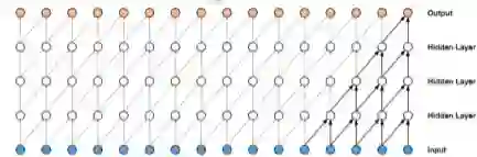 通过多层的因果卷积网络叠加,高层的感受野的大小与网络层数呈线性关系增加。但是为了捕捉更长的历史信息,我们可以在卷积网络中加入 dilated convolution ( 空洞卷积 )。空洞卷积通过有间隔的采样,通过较少的参数实现随着层数增加而指数级增大的感受野 ( receptive field )。相比原来的正常卷积,dilated convolution 多了一个 hyper-parameter 称之为 dilation rate ,对应 kernel 的采样间隔数量,即传统卷积核相邻之间插入 dilation rate-1 个空洞数。当 rate=1 时,相当于传统的卷积核。