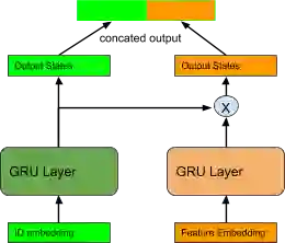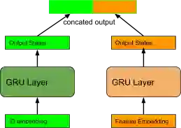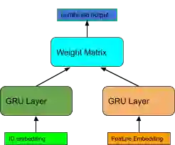 第二种方法是在输出端进行融合:ID 向量和特征向量分别接不同的 GRU,然后将各个 GRU 的输出向量拼接在一起作为最终输出。相比于第一种方法, 这种方法对各个端的特征独立进行建模,在输出端进行拼接后通过后继的全连接层可以隐式加入特征之间的交互。