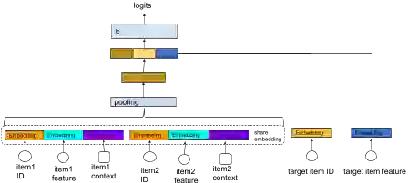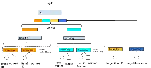 在实际排序过程中,除了事件中的物品 ID 可以作为特征之外,物品本身的属性以及事件上下文也可以用到模型中。可以如图5,把这些特征通过 embedding 层之后进行聚合,拼接成一个长向量,然后输入到多层全连接网络。