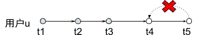 相对于矩阵分解和图推荐,在序列上学习推荐模型最重要的一点是用户某个时刻的行为只受该时刻之前的行为影响,不受用户之后的行为影响,如图2,t4 时刻我们预测用户行为物品,预测的输入只包括: