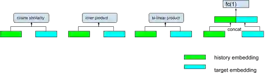 其中 history embedding ( 历史行为向量 ) 表示为 H, target embedding ( 预测物品向量 ) 表示为 T,图4中的几个计算方式可以简单表示为: