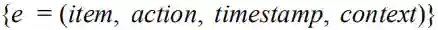 其中item表示物品信息,如物品 ID 以及相关属性,action 表示用户行为信息,如行为类型:浏览 ( impression ),点击 ( click ),购买 ( buy ) 等,timestamp 表示行为发生的时间。context 为事件的上下文信息。将 S 中的元素根据 timestamp 从前到后排序后得到用户的有序行为序列S'=