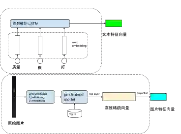 连续型的数值特征可以直接使用,使用前一般会做归一化,使得特征归一到(0,1)之间。物品的文字描述和图片等属于高维特征,通常需要先降维到一个低维度的向量再使用。文字描述一般可以经过分词去停用词等预处理过程,然后将每个词映射为词向量。词向量可使用预训练的词向量模型 ( 如 word2vec,glove ),也可以使用随机初始化的词向量。词向量的序列然后经过 LSTM 等语言序列模型后,生成整个物品的文字描述向量。图片的原始数据通过预处理后经过一个预训练的模型 ( 如 vgg,inception ),取其某一层的输出作为图片向量 ( 如 vgg 的 fc6 )。实际中发现预训练模型的最后几层输出维度比较高但是数据比较稀疏,可以加一个全连接层将高维的稀疏向量映射为一个低维向量,作为最终输出的图片向量。