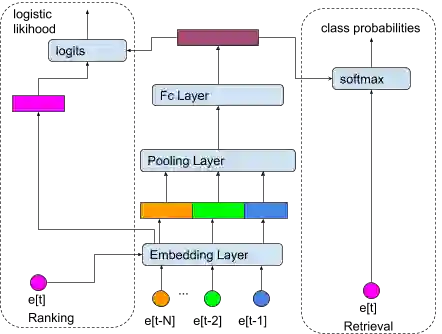 v(a) 是候选物品的向量,上面这个公式即 youtube DNN 做召回的思想:在实际使用中,用 RNN 的输出状态做 k-nearest neighbor search, 得到一个相对较小的候选集合,然后再在这个候选集合中计算每一个候选物品的概率。