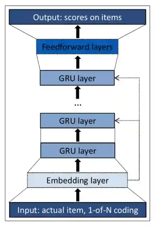 序列中第 N 个时间步输入用户行为物品的 ID,ID 通过 embedding 层映射为向量,并进行归一化。embedding 之后经过一个或者多个 GRU 单元最后接一个 softmax 层获取每个物品的预估概率。为了防止梯度消失的问题,采用了残差网络结构,将上一个 GRU 单元的输出与 embedding 层的输出进行相加,作为下一个 GRU 单元的输入。