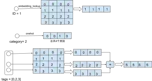 离散特征的向量化可以采用两种方式:1. embedding lookup;2. onehot。embedding lookup 通过 ID 在一个大小为 M x d 的矩阵中查找到该特征编号所对应的行,作为特征的向量,其中 M 是该离散特征的取值个数,d 是特征向量的维度。onehot 则是定义一个0-1向量,其中向量长度是特征所有取值的个数,而特征的具体值对应向量中的下标,该下标对应的 one-hot 元素值为1,其他位置下标的值为0。如果是 multivalent 特征,则将各个特征取值对应的向量进行相加,得到特征的向量。