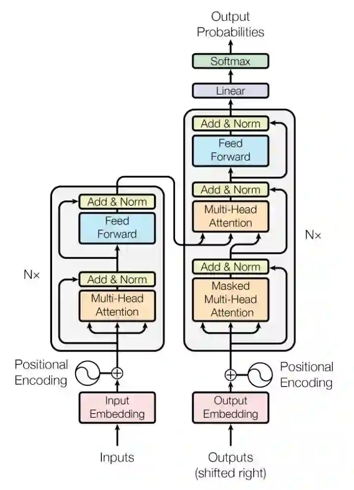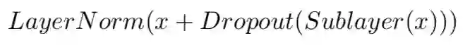 在 Multi-Head Attention 和 FFN 的输出中都加入了残差连接和 Layer Normalization。残差连接中将模块的输入加到模型的输出中,以防止随着模块层数加深出现的梯度消失问题。LN 对序列中每个位置的输出状态向量进行标准化,使得输出数据的整体分布更加稳定。自注意力模型中没有使用 Batch Normalzation,因为 BN 受到 batch size,sequence length 等因素的影响,并不适合序列模型。LN 和残差连接使用公式如下:
