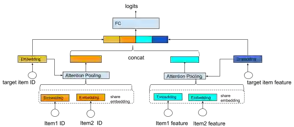 上图为 attention 的示例和公式, 计算预测物品与历史序列物品之间的相关度,