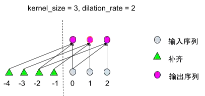 在具体实现因果卷积时,我们可以采用在序列的开头进行补齐的方法保证输出序列的长度与输入序列保持一致,每层输入补齐的长度是: