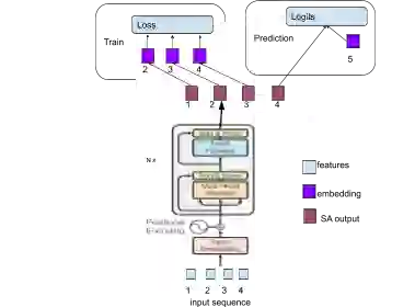 假设输入序列经过 embedding 后的向量是 X,X 的维度分别是 [B, L, H],其中 B 表示批处理的大小,L 是序列的长度,H 是隐层大小。输入序列向量经过一个或者多个自注意力模块,最终输出一个跟输入序列长度一样的输出序列:[B, L, H]。通过多个自注意力模块的叠加,逐渐让网络学习到序列中的各个事件之间更复杂的关系,迭代地构建输入序列的整体信息。