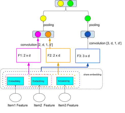 从上面 MLP 模型我们可以看到,用户历史序列的向量是通过全局 pooling 的方式得到的,相当于对用户的历史行为做了一个全局描述。但是在用户的历史行为中会存在着一些局部的连续行为模式,比如用户在过去几天内连续买过婴儿用品,那么在推荐中我们可以根据这个信息向用户推荐一些跟育儿相关的商品。在全局的 pooling 层我们有可能会丢失这些局部行为信息,因此可以建立模型来对用户行为中的局部行为模式进行建模,而局部信息建模的一个理想候选模型则是卷积神经网络 ( Convolution Neural Network )。