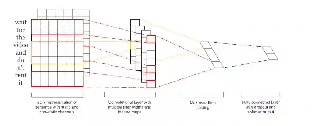 图中输入句子分词后的序列是 "wait fro the video and do n't rent it",建模步骤从左至右:第一步先将每个词映射为词向量,生成一个 n x k 的二维矩阵,其中 n 是句子的长度,k 是词向量的维度;第二步在 n x k 的矩阵上进行卷积。卷积核 [卷积高度,卷积宽度,输入维度,输出维度 ] 中卷积高度是一个超参数,由调用方指定每次卷积要覆盖的连续词的个数,卷积宽度需要跟词向量的维度一致,这是因为每一个向量代表一个词,在抽取特征的过程中,词做为文本的最小粒度,应该保证其信息的完整性。输入维度为1,输出维度由调用者指定。一般情况下,我们会使用多个卷积核,如上图中的红色和黄色部分,分别对应卷积高度等于2和卷积高度等于3的卷积核。多个卷积核在不同的局部范围内运用相邻连续词的上下文进行建模,从而从不同的粒度去刻画句子序列的信息 ( 一般情况下,卷积高度我们一般取2或者3,对应 bi-gram 和 tri-gram )。每个卷积核的输出通过池化层进行降维,通常使用最大值池化 ( max-pooling ),最后各个池化层的输出拼接在一起,送到全连接 softmax 层。
